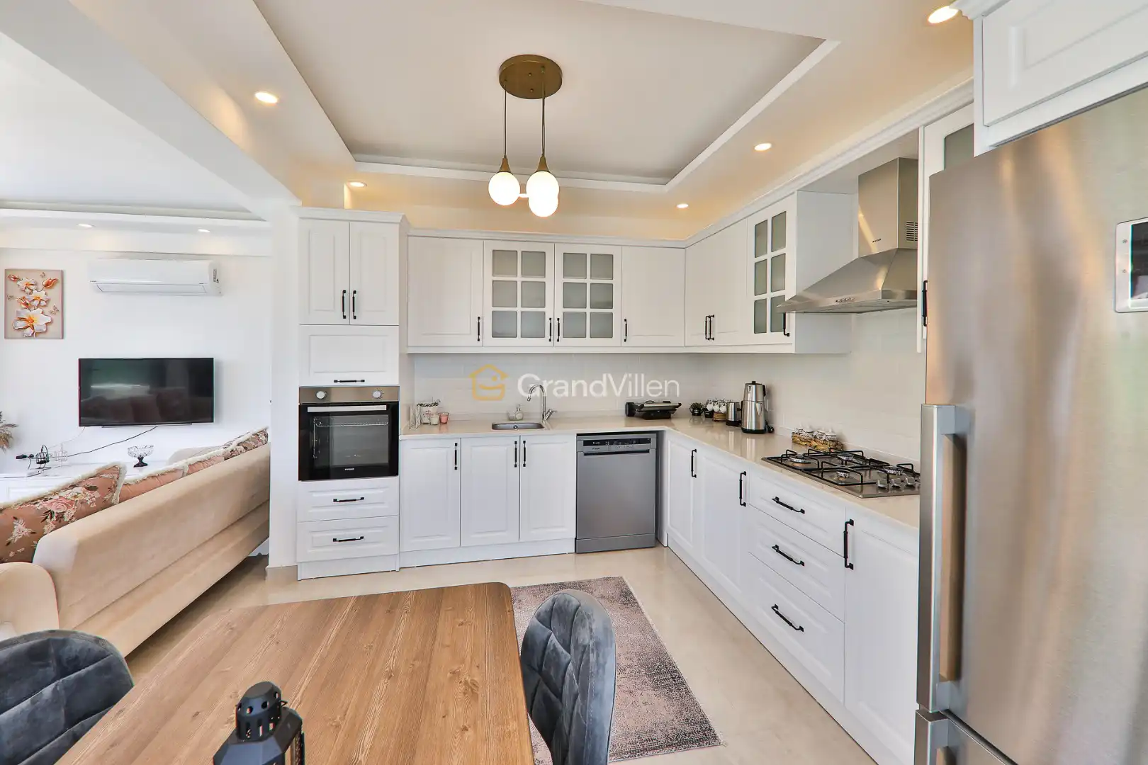 Die moderne amerikanische Küche ist ausgestattet mit einem Kühlschrank, Geschirrspüler, Waschmaschine, Backofen, Mikrowelle, Wasserkocher, einem 4-Flammen-Herd, einem 6-Personen-Geschirrset und allen notwendigen Küchenutensilien.